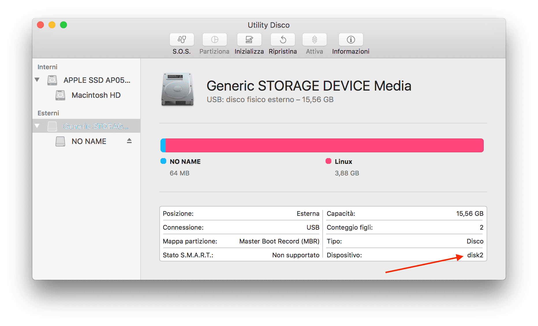 Una volta selezionata, si aprirà una finestra in cui è possibile vedere, sotto la voce Dispositivo il nome del file in questione. Nel mio caso è disk2 come potete vedere nell'immagine sottostante.
