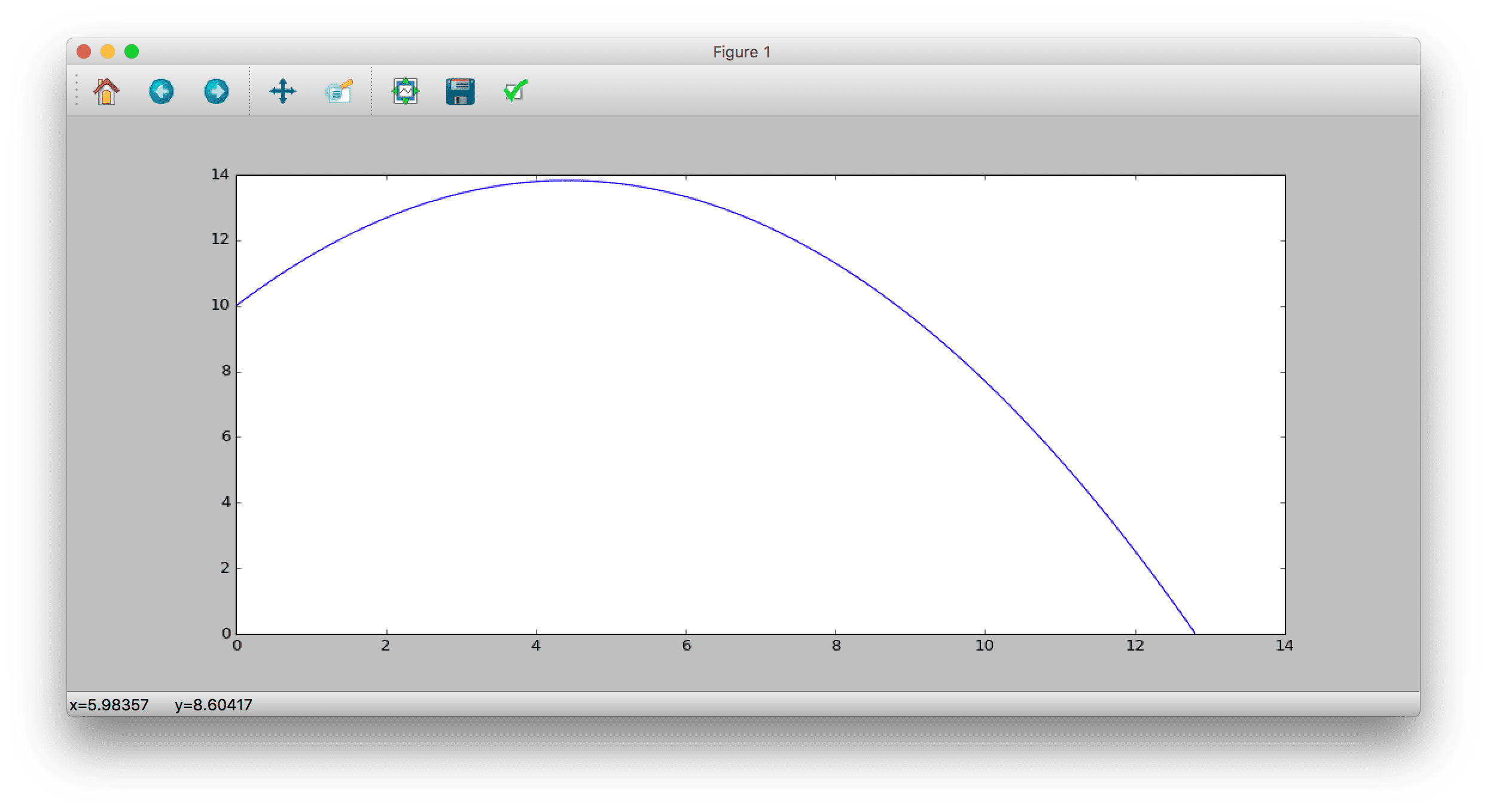 # -*- coding: utf-8 -*-"""Spyder EditorThis is a temporary script file."""from pylab import *g = 9.81 #m/s**2v0 = 10. #m/salpha = pi/3 #radiantih0 = 10. #mvx = v0*cos(alpha)vy = v0*sin(alpha)tf = (vy + sqrt(vy**2+2*g*h0))/gxf = vx*tft = arange(0,tf, 0.01)xt = vx*tyt = h0+vy*t-0.5*g*t**2plot(xt,yt)