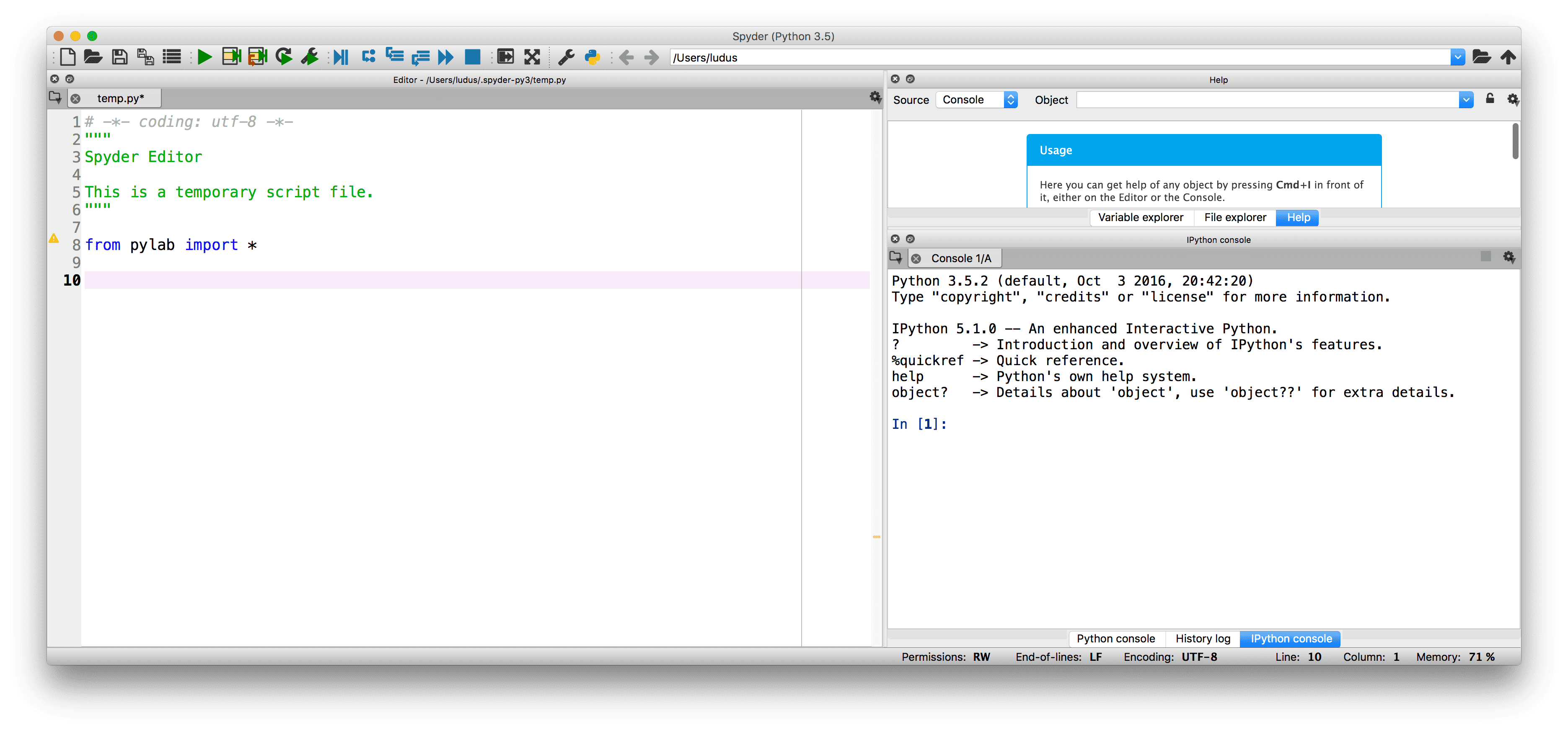 Nella finestra indicata come Editor (a me è mostrata sulla destra), possiamo andare ad implementare il codice che poi verrà eseguito da python. Sulla finistra indicata come Console potremo interagine utilizzando la console dinamica iPython. Per il momento, limitiamoci ad utilizzare l'editor di testo per rendere il programma più leggibile.