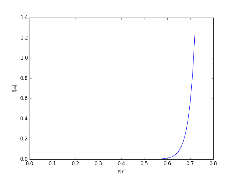 from pylab import *def diode(v, I0, VT):return I0*(exp(v/VT)-1)I0 = 1e-12VT = 25.85e-3v = arange(0, 0.73, 0.01)plot(v, diode(v, I0, VT))xlabel("$v [V]$")ylabel("$i [A]$")