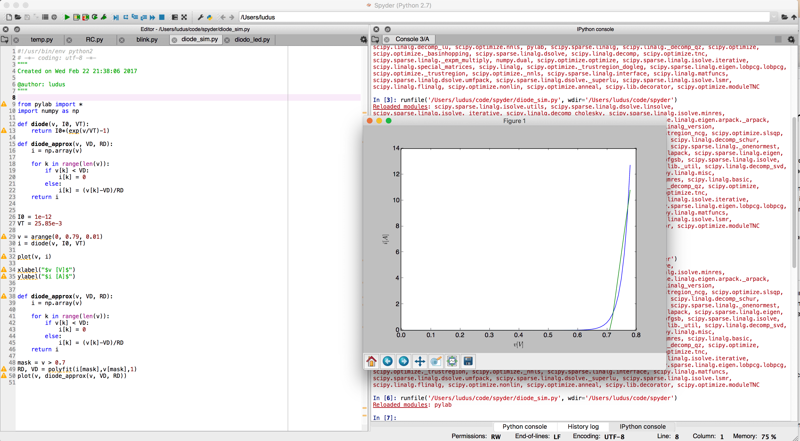 Utilizzando i valori tipici per queste due costanti ( e ), è possibile simulare un classico diodo di silicio in Python e Spyder. Lo script utilizzato è il seguente
