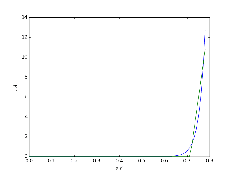 from pylab import *import numpy as npdef diode(v, I0, VT):return I0*(exp(v/VT)-1)def diode_approx(v, VD, RD):i = np.array(v)for k in range(len(v)):if v[k] < VD:i[k] = 0else:i[k] = (v[k]-VD)/RDreturn iI0 = 1e-12VT = 25.85e-3v = arange(0, 0.79, 0.01)i = diode(v, I0, VT)plot(v, i)xlabel("$v [V]$")ylabel("$i [A]$")def diode_approx(v, VD, RD):i = np.array(v)for k in range(len(v)):if v[k] < VD:i[k] = 0else:i[k] = (v[k]-VD)/RDreturn imask = v > 0.7RD, VD = polyfit(i[mask],v[mask],1)plot(v, diode_approx(v, VD, RD))
