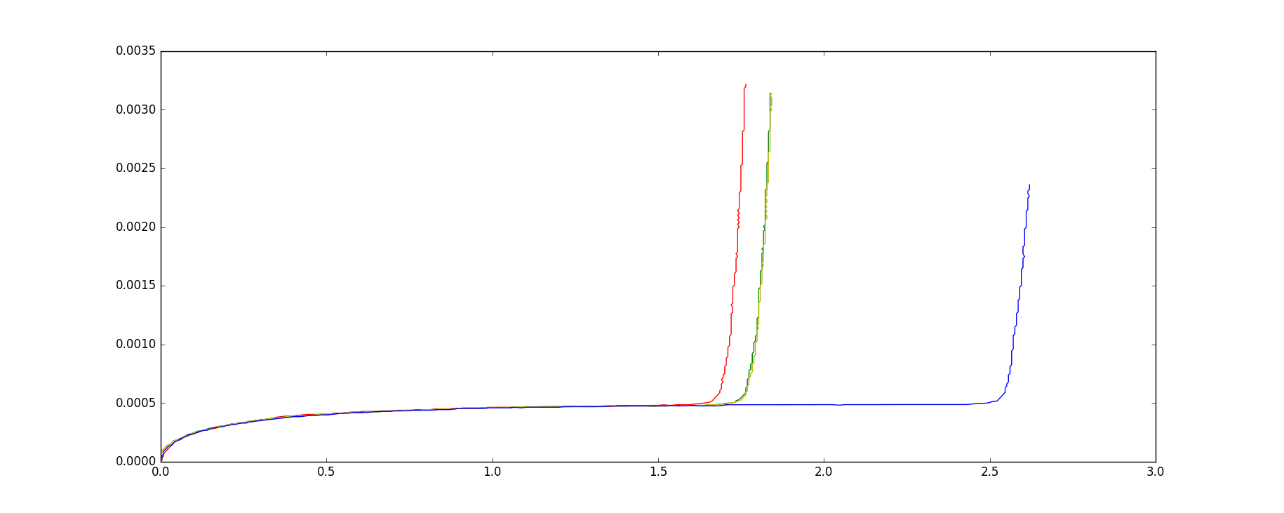 from led import characterize_led# Inserisco led bluvb, ib = characterize_led()plot(vb, ib, 'b')# Inserisco led rossovr, ir = characterize_led()plot(vr, ir, 'r')# Inserisco led giallovy, iy = characterize_led()plot(vy, iy, 'y')# Inserisco led verdevg, ig = characterize_led()plot(vg, ig, 'g')