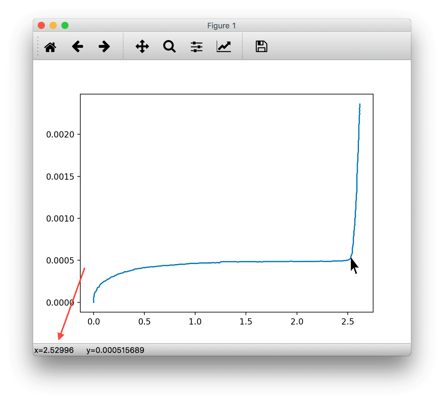 Alla fine del tutorial precendete, eravamo arrivati a disegnare la curva caratteristica di vari led colorati. Tramite l'immagine disegnata in iPython o Spyder, possiamo misurare in modo molto accurato il punto in cui la curva inizia a salire, utilizzando il puntatore del mouse del computer e leggendo la sua posizione nel grafico (visualizzata in basso a destra).