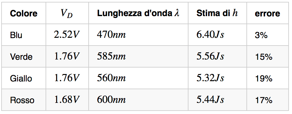 Confrontando questo valore sperimentale con uno delle misure più precise disponibile per la costante di Planck: otteniamo un errore di circa il (non male no? Con gli altri led mi è andata peggio).