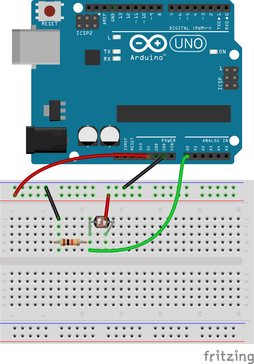 Prima di iniziare l'esperimento vero e proprio, dobbiamo però costruire un semplice sensore di luminosità utilizzando Arduino, una resistenza ed un fotoresistenza.