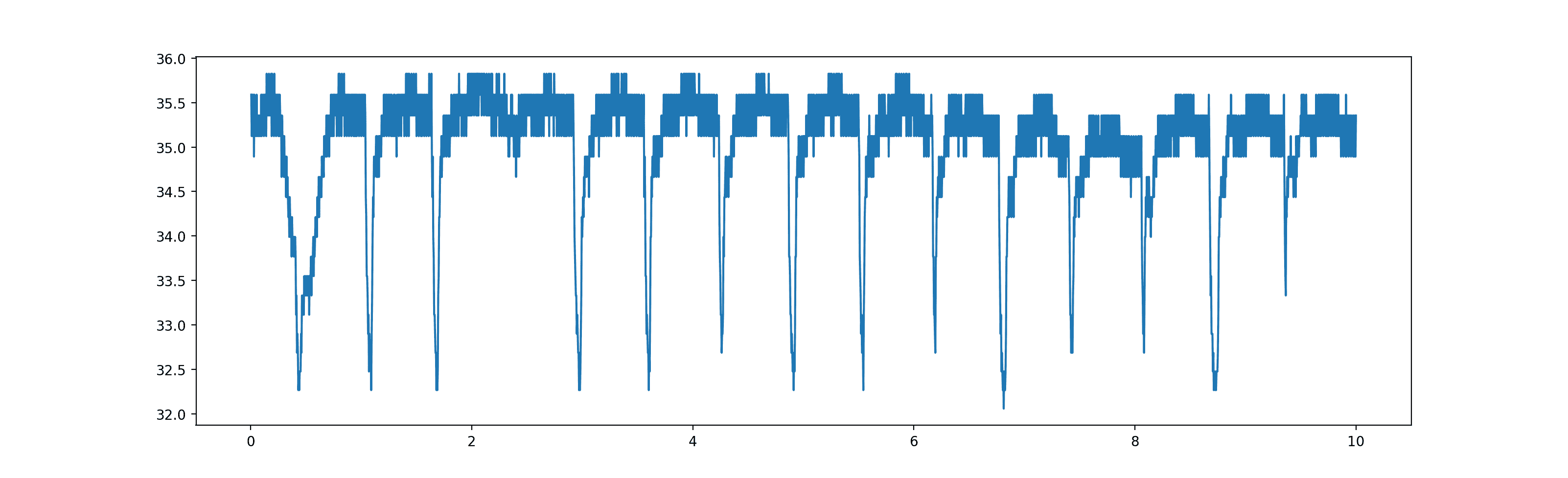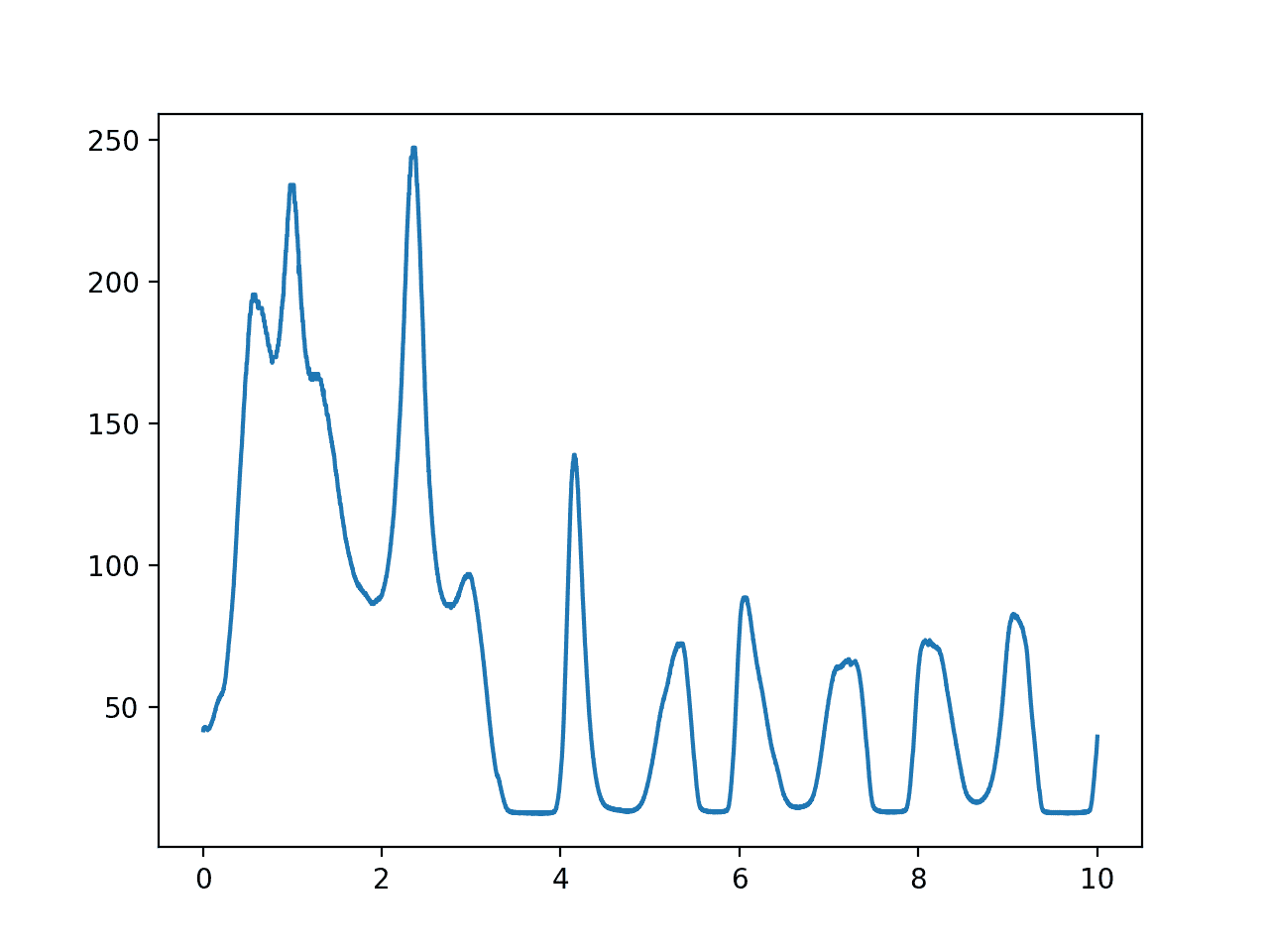 def plot_lux(T):from datetime import datetime, timedeltastart_time = datetime.now()stop_time = start_time + timedelta(0, T)times = []luxs = []while datetime.now() < stop_time:L, R = luxmeter()times.append((datetime.now() - start_time).total_seconds())luxs.append(L)plot(times, luxs)