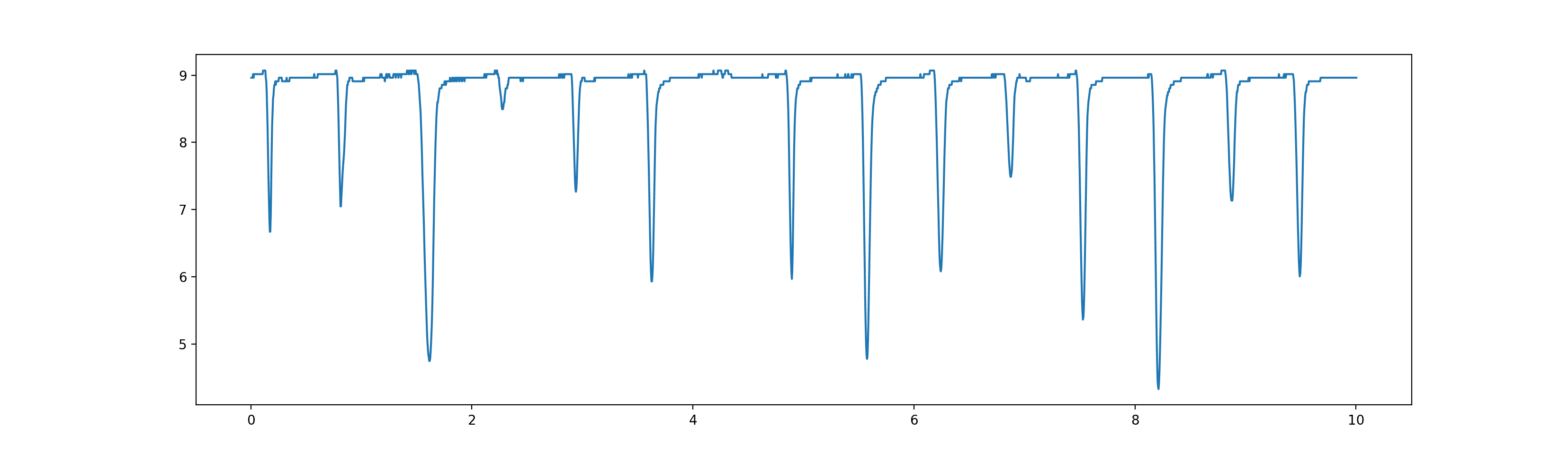 Con questa funzione, possiamo quindi disegnare come varia la luminosità nella stanza. Questo è un esempio ottenuto lanciando la funzione plot_lux(10) (quindi campionando per secondi) e muovendo casualemtne la torcia del cellulare sopra il sensore.