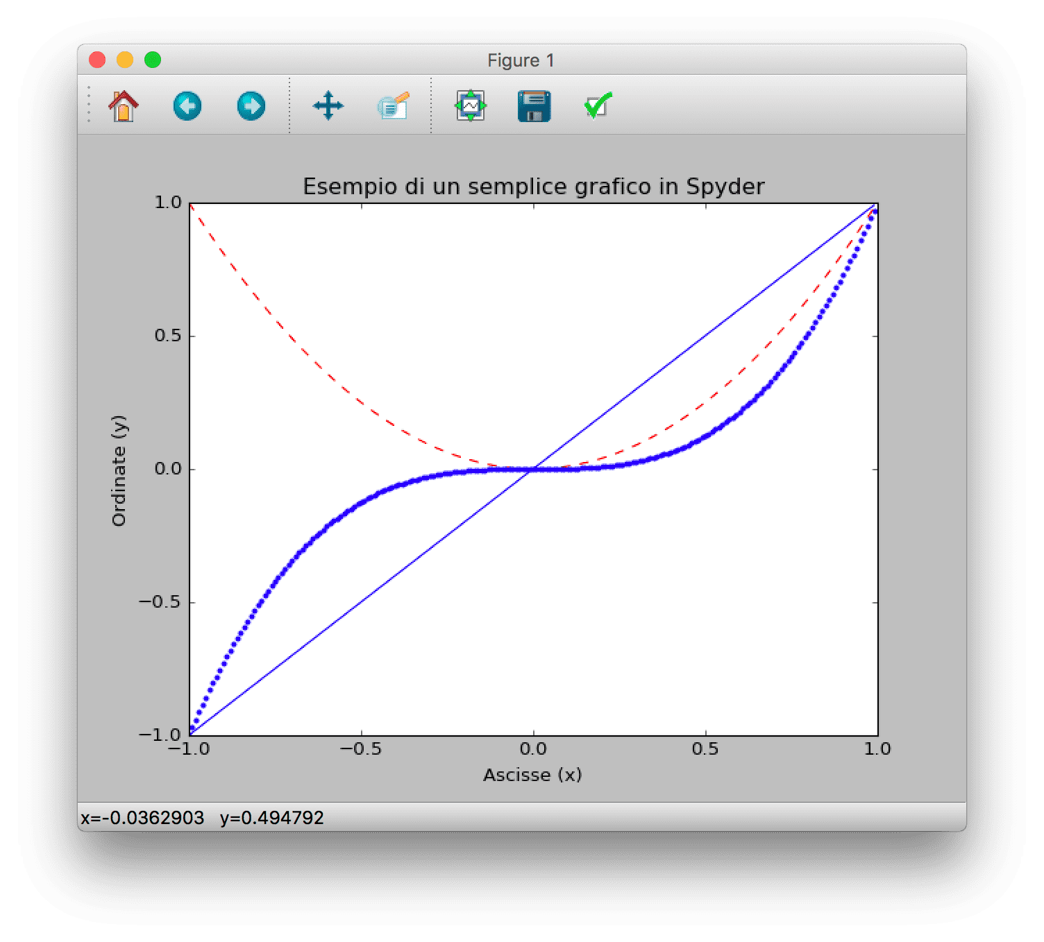 Vediamo come utilizzare i maker. Torniamo nuovamente alla finestra di Spyder (senza chiudere quella del grafico), e disegniamo la parabola in rosso tratteggiato e la cubica in blu puntinato: