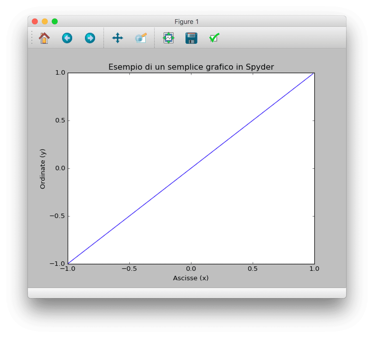 title('Esempio di un semplice grafico in Spyder')xlabel('Ascisse (x)')ylabel('Ordinate (y)')