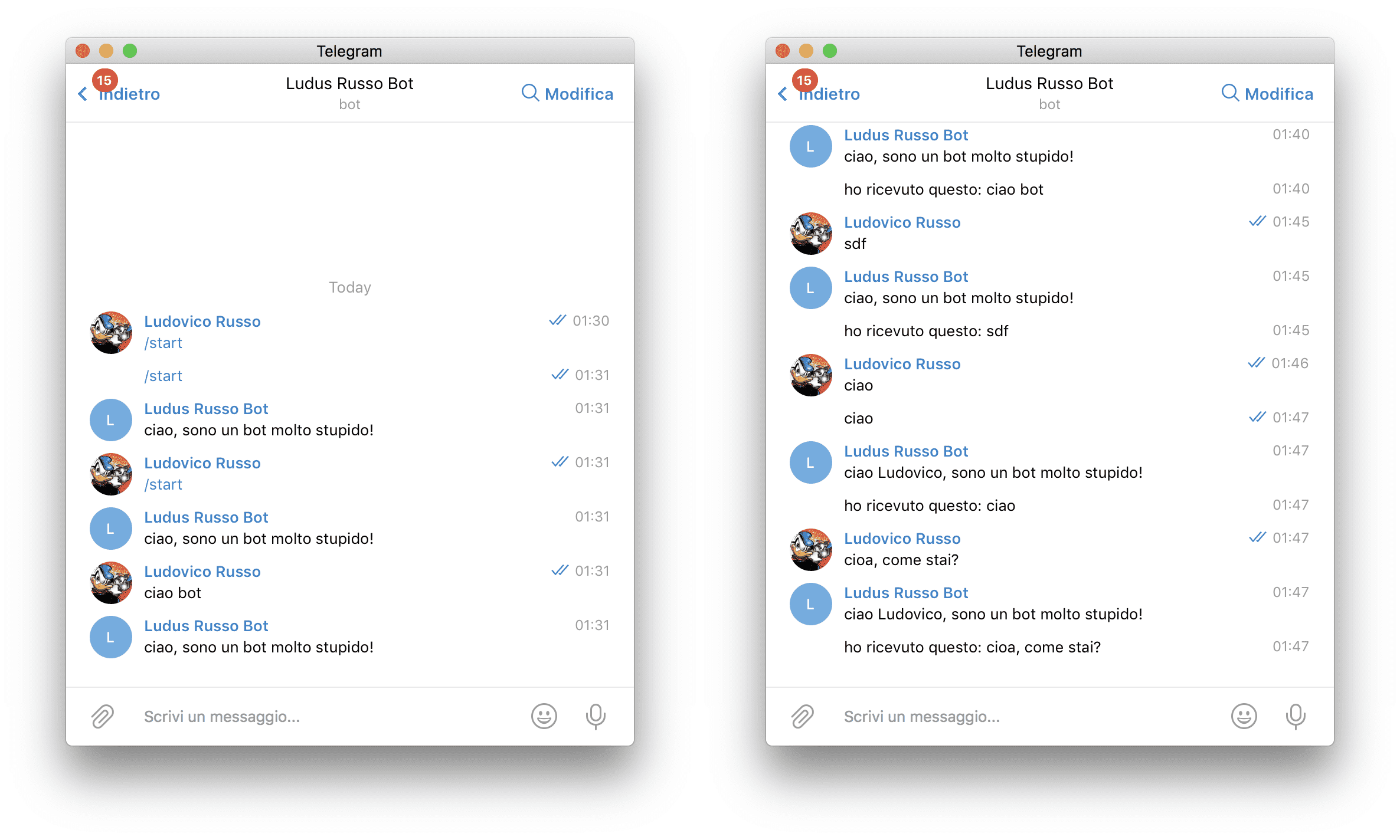 Una volta in funzione, apriamo la chat telegram ed iniziamo a messaggiare con il nostro bot. Per chiudere il programma, semplicemente basta premere i pulsanti ctrl-C dal terminale.