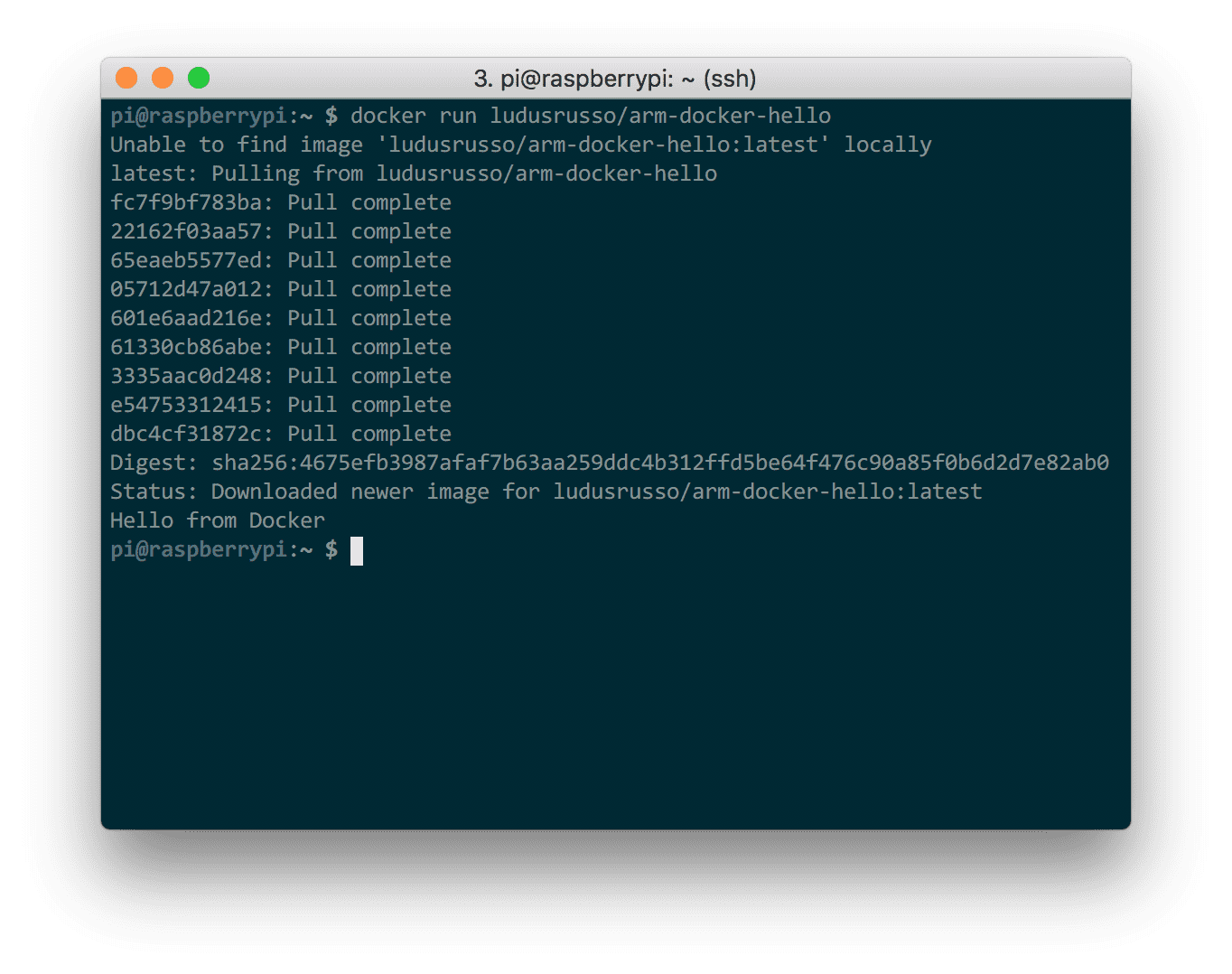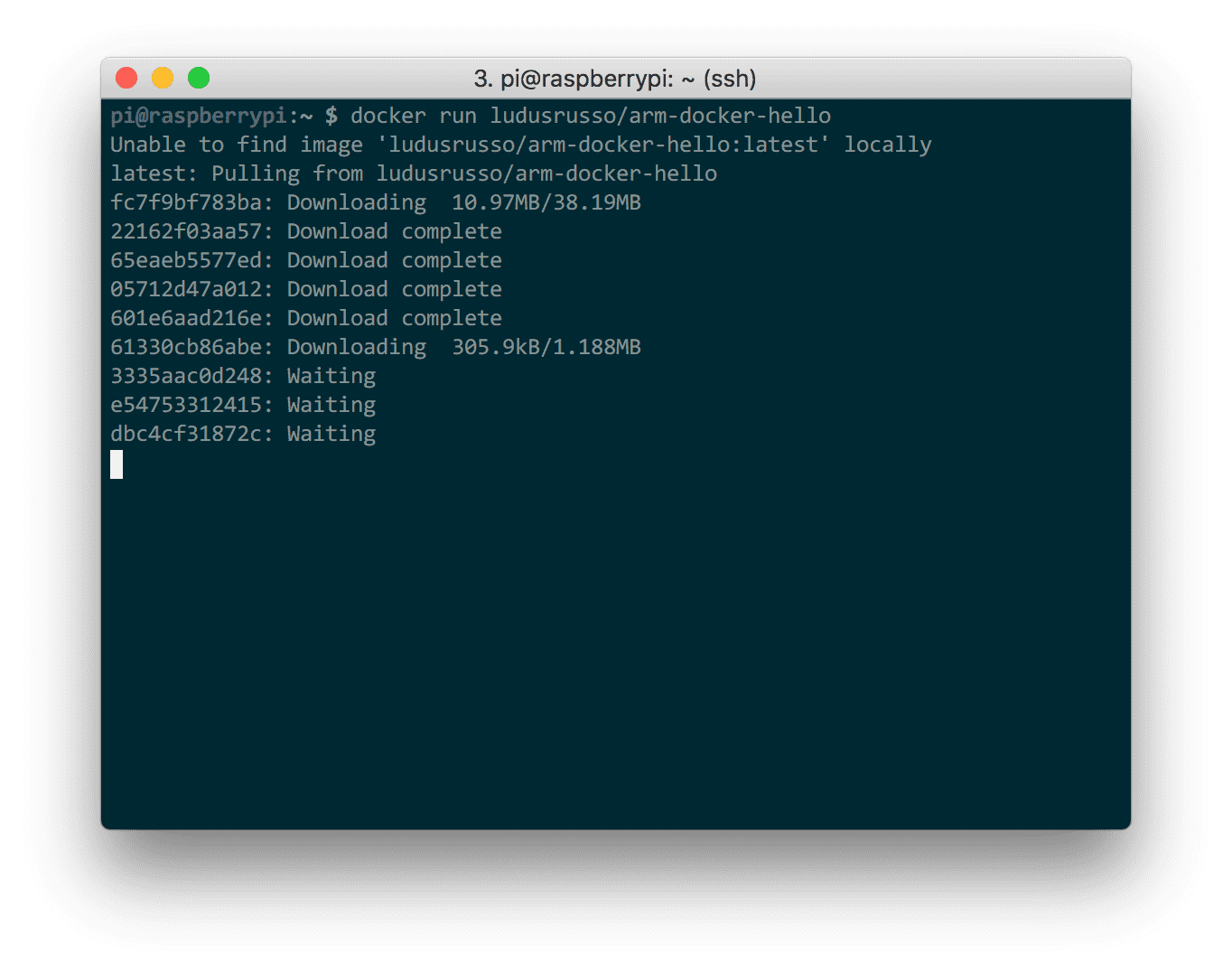 Come vedrete, docker si accorge che l'immagine non esise in locale sul Raspberry e la scarica in automatico prima di eseguirla.