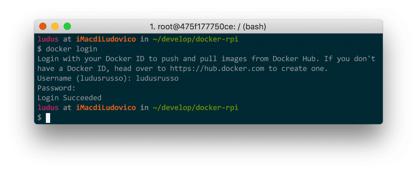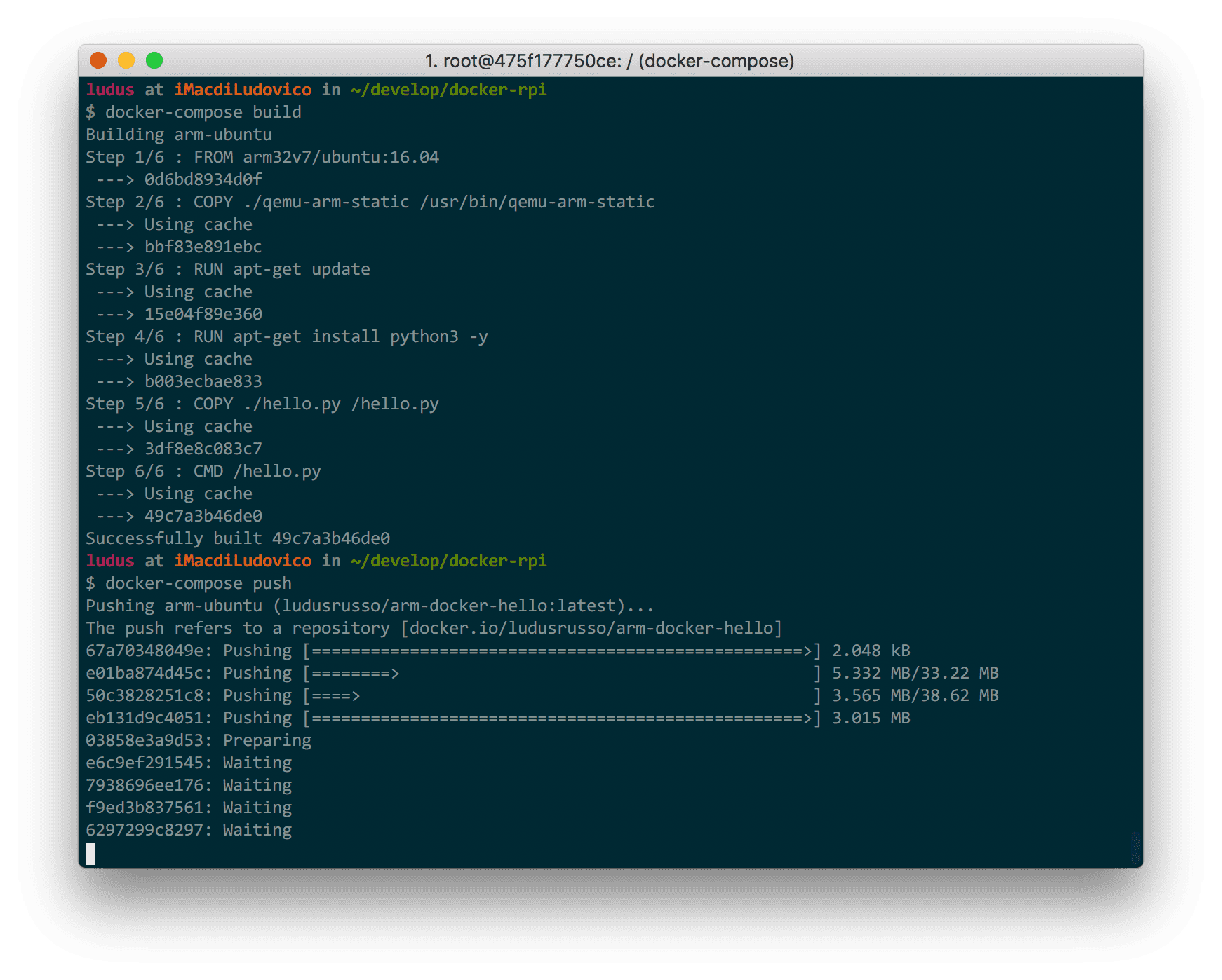 A questo punto, otterremo un tag della nostra immagine (che ha la forma <nome utente>/<nome immagine>) che dovremmo usare per fare il deploy ed il download. Nel mio caso è ludusrusso/arm-docker-hello.