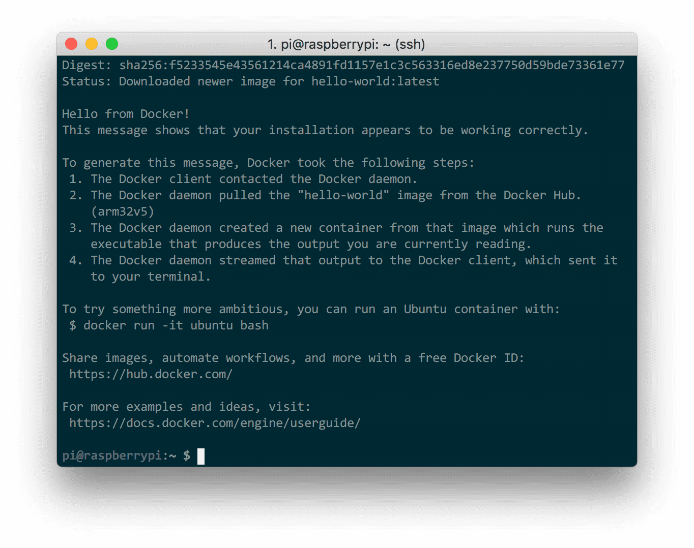 Il quale esegue uno script che installa e configura docker sul vostro Raspberry Pi (si noti che lo stesso identico comando funziona anche su macchine standard Linux e su ogni macchina Linux compatibile con docker, non è quindi specifico del Raspberry Pi).