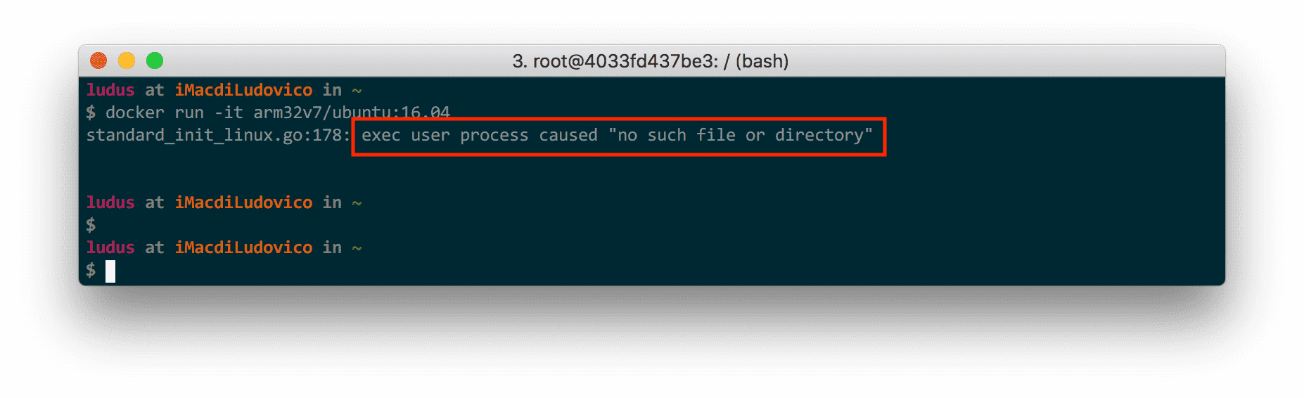 Però non funzionerà il container (o la classe di container) che ci interessa (arm32v7/ubuntu:16.04), che restituirà l'errore standard_init_linux.go:178: exec user process caused "no such file or directory" che essenzialmente indica che qemu-arm-static non è ancora stato registrato al suo interno.