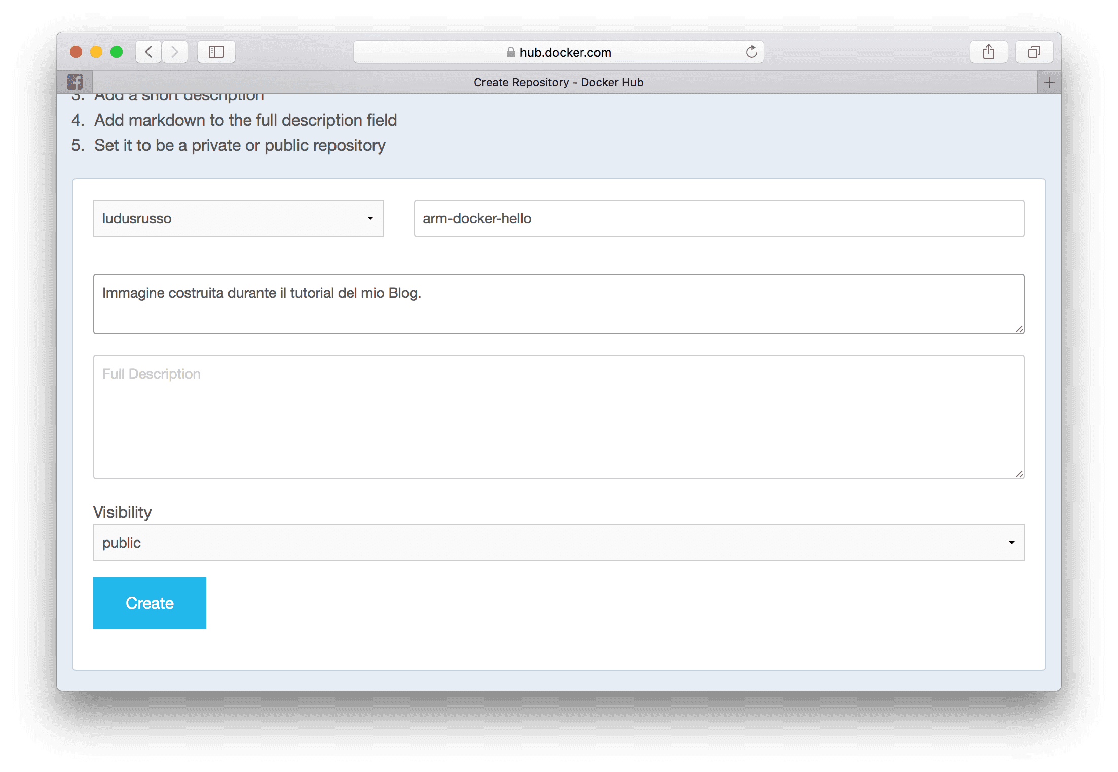 Per prima cosa, se non lo avete già fatto, dovete iscrivervi in modo da avere un accesso ed un nome utente. Per farlo, basta accedere al sito https://hub.docker.com/ e seguire le istruzioni per creare un account. Prendete nota del vostro username (il mio è ludusrusso).