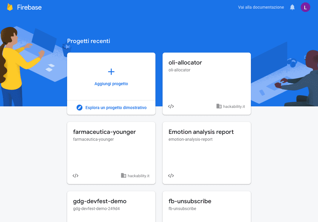 Partiamo con le cose più semplici. Ci serve accedere alla console firebase e creare un nuovo progetto. Il processo è super semplice, dobbiamo scegliere un nome, abilitare google analytics (se vogliamo) e aspettare qualche secondo!