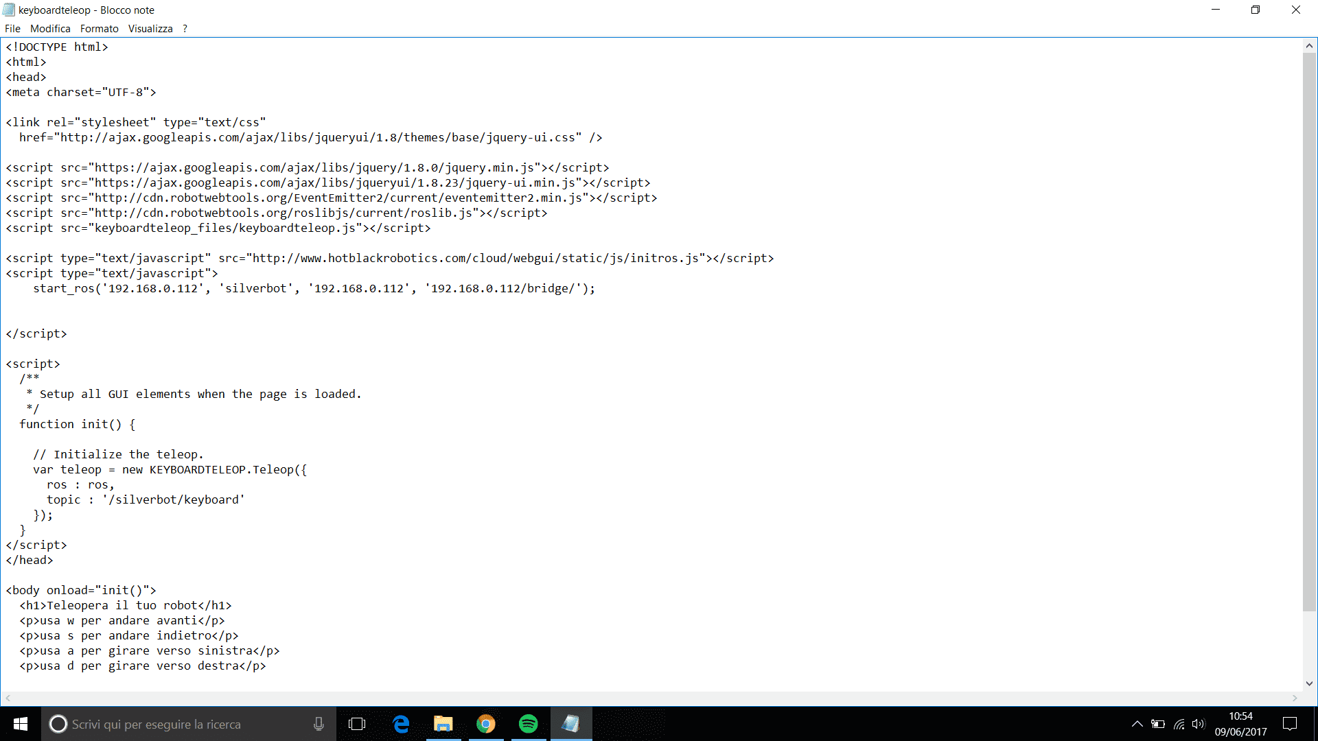 Ora è necessario far sì che la nostra webapp sia in grado di dialogare con il nostro robot. Aprite il file html keyboard_robotarm con il blocco note e cercate la stringa start_ros('192.168.0.112', 'silverbot', '192.168.0.112', '192.168.0.112/bridge/');