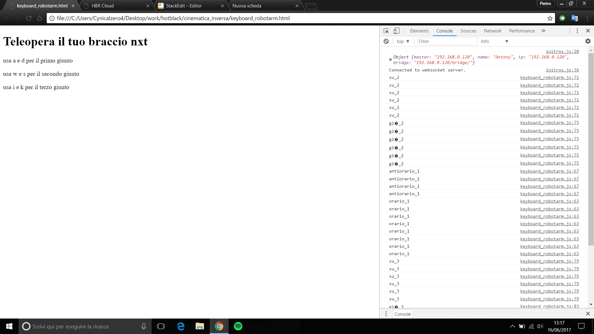 Possiamo ora testare la nostra app: aprite il file keyboard_robotarm nel browser e aprite la console cliccando col tasto destro del mouse e selezionando ispeziona. Refreshate la pagina (F5) e ogni volta che premete uno dei pulsanti wa, sd, ik la console dovrebbe restituirvi, stampandola a video, l'azione connessa al pulsante premuto.