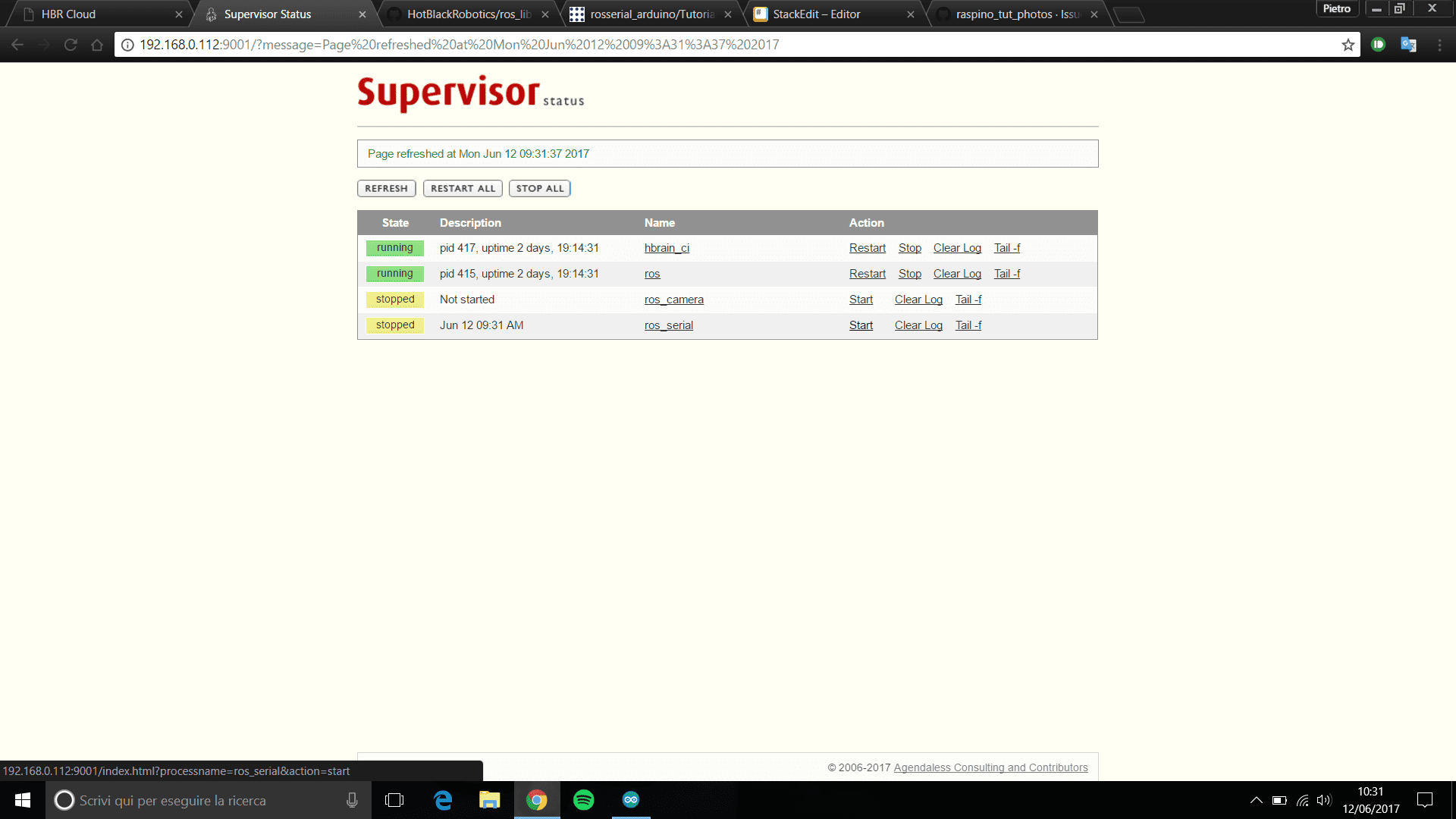Si aprirĂ in questo modo una pagina chiamata supervisor status. Cercate la voce ros_serial e cliccate su Start
