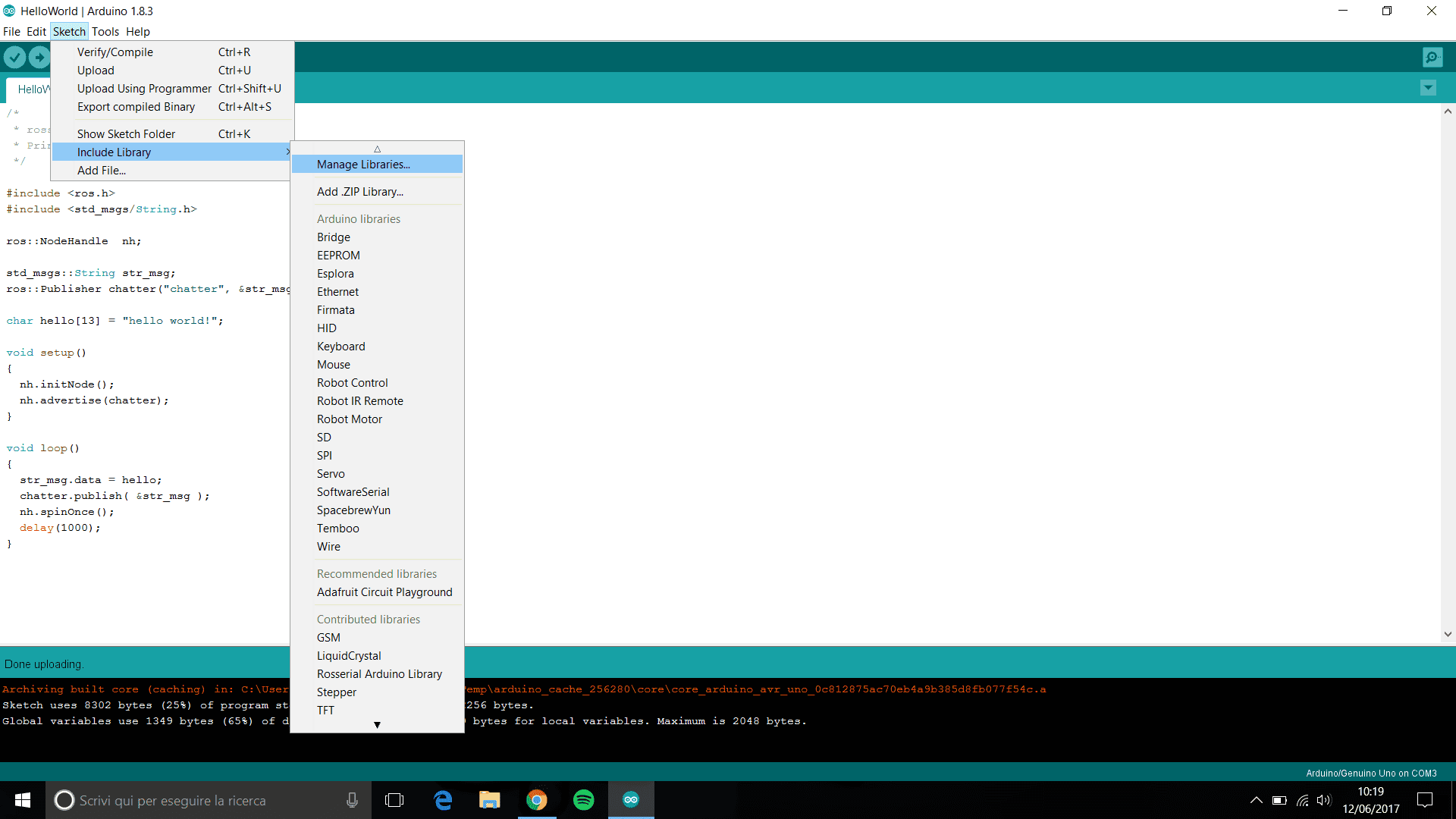 Procediamo ora a scrivere il codice di un semplice pulisher per pubblicare una stringa testuale sulla console ROS. Apriamo quindi l'Arduino IDE e iniziamo un nuovo progetto. Andiamo ad includere immediatamente le librerie che utilizzeremo e la stringa ros::NodeHandle nh; che permetterĂ al nostro programma di creare publisher e subscriber: