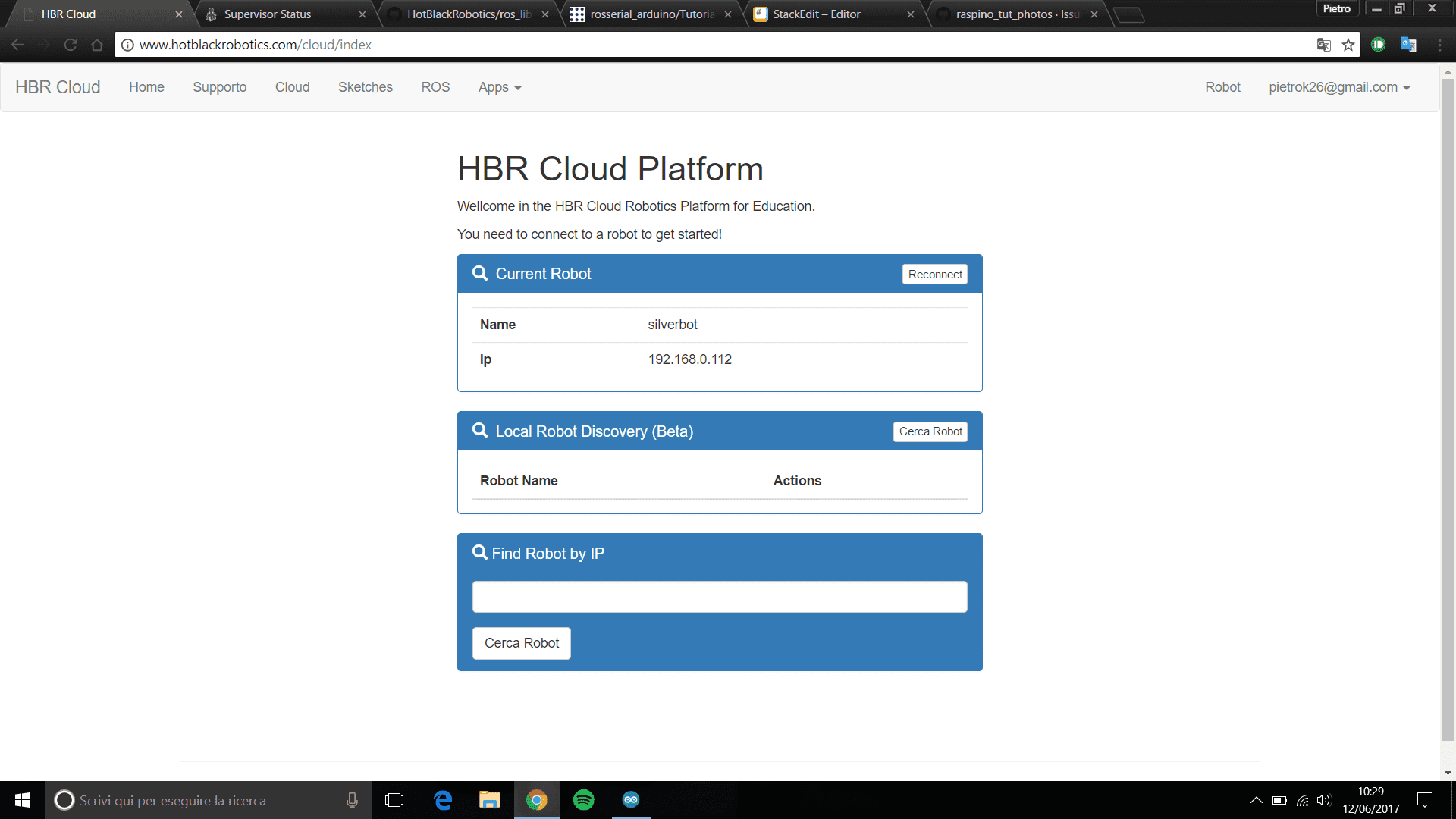 A questo punto Arduino è in grado di comunicare con ROS pubblicando o sottoscrivendosi ai topic. E' però necessario predisporre anche il Raspberry per poter comunicare con l'Arduino: collegate la vostra scheda al portale hotblack e digitate nella bara di ricerca di Google l'indirizzo IP assegnatovi dal sito (nel mio caso 192.168.0.112)