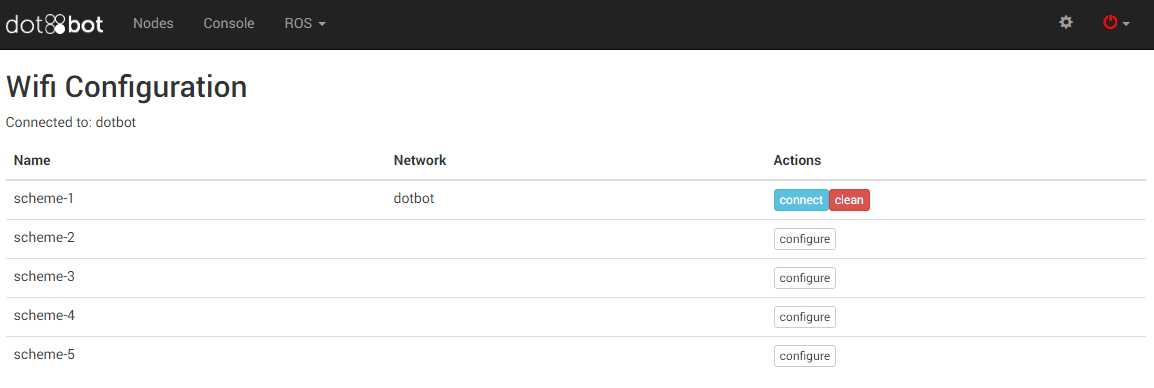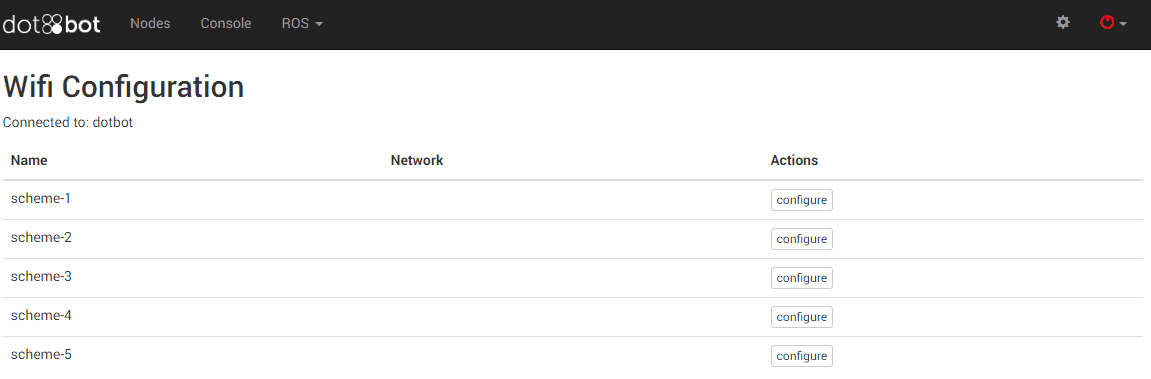 Ora su Chrome andate su http://hotbot.local/wifi/schemes e si aprirà una schermata simile a questa. NB se il vostro robot ha un nome diverso perchè avete cambiato voi il nome in (ad. esempio blot) dovete modificare l'indirizzo a cui accedere da hotbot al nome che avete scelto tipo http://nome_che_avete_scelto.local/wifi/schemes (ad esempio http://blot.local/wifi/schemes).