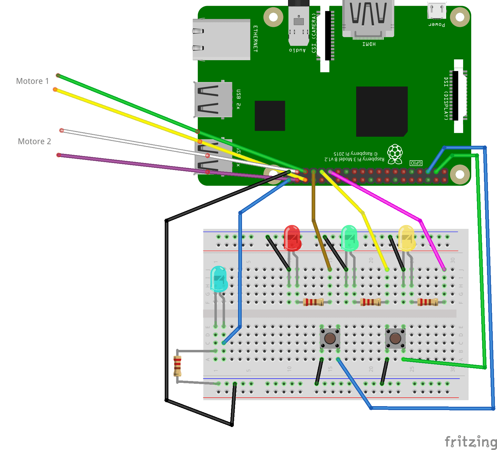 Collegando i fili per i MOTORI ai GPIO 16,19 (sinistra) e 20,26 (destra). I LED 1,2,3 ai GPIO 5,6,13 e gli INTERRUTTORI a 2 e 3.