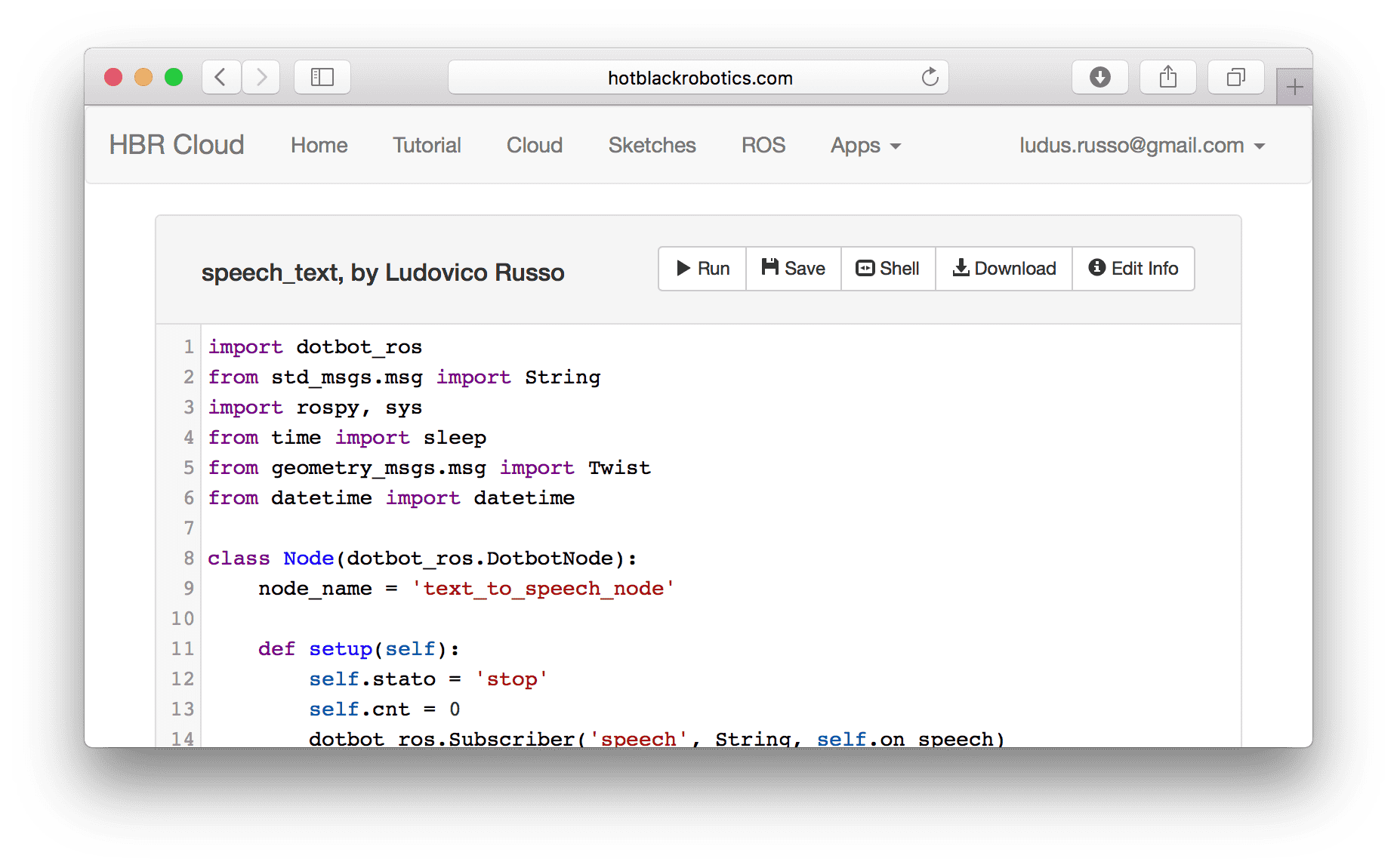 La prima cosa che vedete della nostra piattaforma è un editor di testo che permette di sviluppare codice python e ROS in modo semplice e veloce, utilizzando un'interfaccia internet che permette anche di programmare remotamente il robot se raggiungibile tramite IP pubblico.