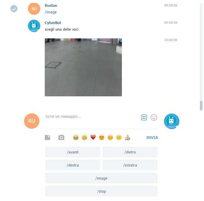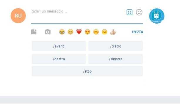 elif domanda == '/avanti':self.bot.sendMessage(chat_id, "ok, vado avanti")self.robot.forward()time.sleep(0.25)self.robot.stop()elif domanda == '/dietro':self.bot.sendMessage(chat_id, "ok, vado dietro")self.robot.backward()time.sleep(0.25)self.robot.stop()elif domanda == '/destra':self.bot.sendMessage(chat_id, "ok, giro a destra")self.robot.right()time.sleep(0.2)self.robot.stop()elif domanda == '/sinistra':self.bot.sendMessage(chat_id, "ok, giro a sinistra")self.robot.left()time.sleep(0.2)self.robot.stop()elif domanda == '/stop':self.robot.stop()else:self.bot.sendMessage(chat_id, "scusa, non capisco questo comando")