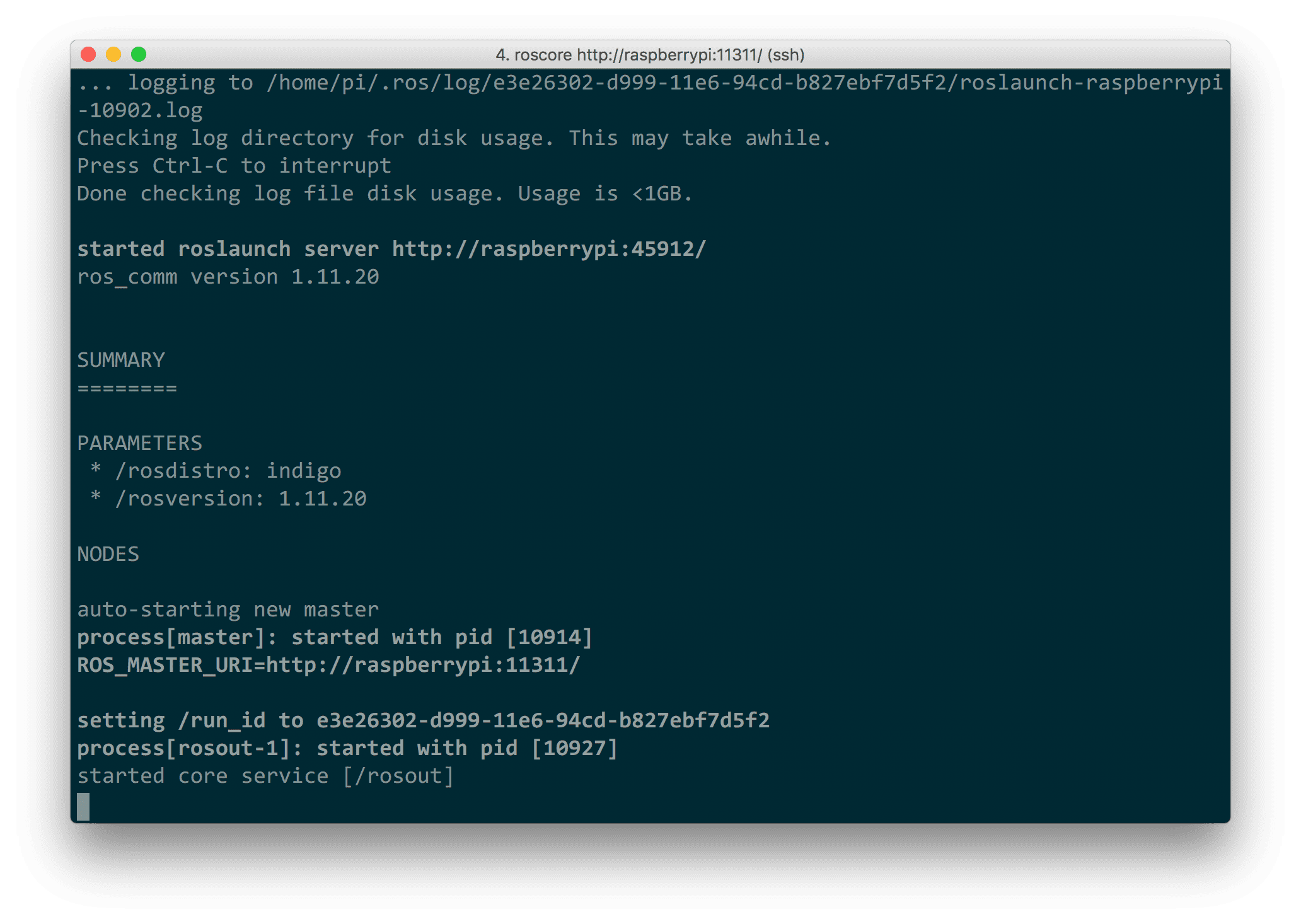... logging to /home/pi/.ros/log/e3e26302-d999-11e6-94cd-b827ebf7d5f2/roslaunch-raspberrypi-10902.logChecking log directory for disk usage. This may take awhile.Press Ctrl-C to interruptDone checking log file disk usage. Usage is <1GB.started roslaunch server http://raspberrypi:45912/ros_comm version 1.11.20SUMMARY========PARAMETERS* /rosdistro: indigo* /rosversion: 1.11.20NODESauto-starting new masterprocess[master]: started with pid [10914]ROS_MASTER_URI=http://raspberrypi:11311/setting /run_id to e3e26302-d999-11e6-94cd-b827ebf7d5f2process[rosout-1]: started with pid [10927]started core service [/rosout]